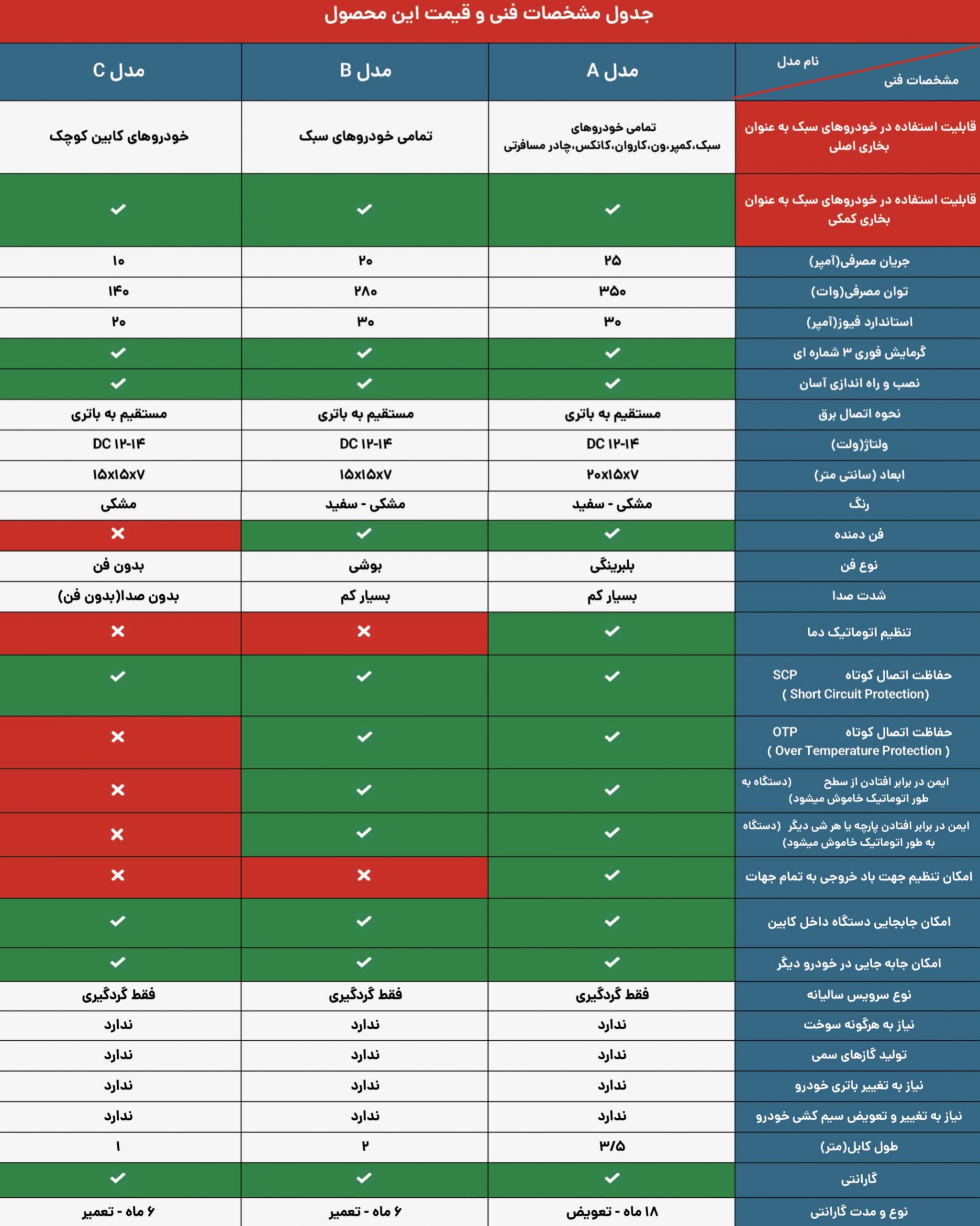 مدل A نسبت به مدل B و C دارای 50 درصد توان گرمایشی و لوازم تنظیمی و حفاظتی بیشتر است.